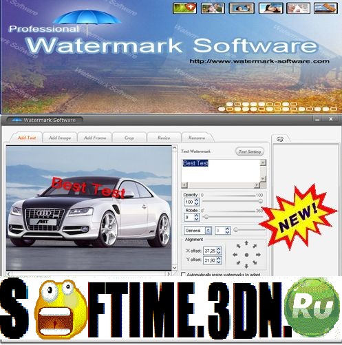 Watermark Software - программа для наложения водяных знаков на ваши изображения. Программа поможет вам добавлять текст, графику и логотипы на ваши картинки для защиты ваших авторских прав. Кроме нанесения водяных знаков, данная программа позволит вам добавлять привлекательные рамки к вашим фотографиям, обрезать фотографии, переименовывать несколько файлов в пакетном режиме, изменять размер изображений и многое другое. Данная утилита обладает быстрой обработкой фотографий и имеет поддержку всех популярных графических форматов. Программа имеет приятный и легкий в использовании пользовательский интерфейс. Возможности программы: |